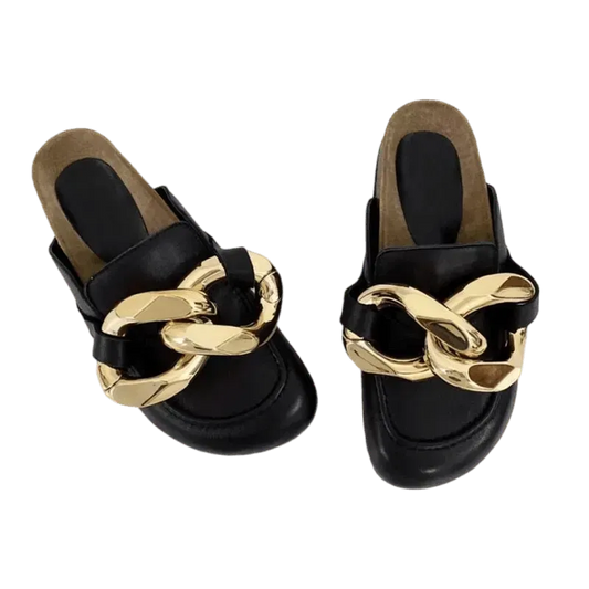 Sandales à enfiler avec grosse chaîne en or -
