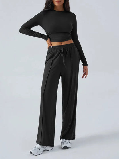 Featuring a solid pattern with a classic crewneck and long sleeve top, this outfit includes a matching wide-leg pant with a drawstring waist and slant pockets. The relaxed profile and soft touch of knitted viscose-blend fabric make this two-piece set effortlessly stylish and breathable for all-season lounging.