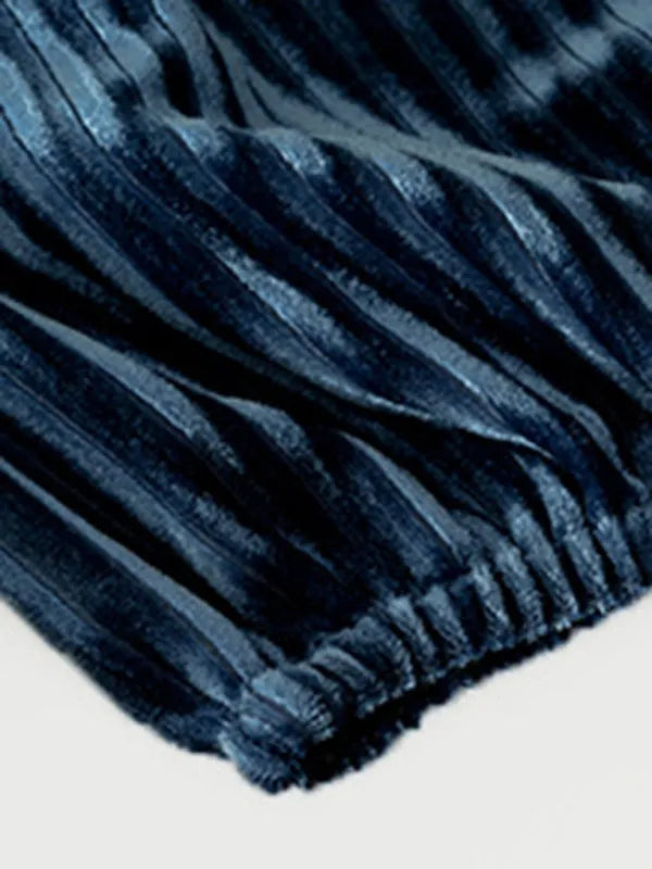 The top features a classic crewneck and long sleeves, while the bottom offers flattering wide-leg pants enhanced by an elastic waist. The striped detail adds modern flair, complemented by a relaxed fit and woven finish that is light enough for in-between-season layering.